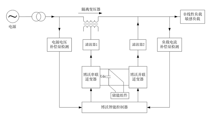 串聯(lián)逆變器實現(xiàn)對電源電壓的補償,使得負載獲得正弦交流電壓;并聯(lián)逆變器實現(xiàn)對負載電流的補償,使電源獲得正弦交流電流,串聯(lián)逆變器和并聯(lián)逆變器協(xié)同工作,進而實現(xiàn)負載獲得高質(zhì)量的正弦波電壓、電網(wǎng)獲得高質(zhì)量的正弦波電流。綜合改善電壓質(zhì)量(諧波、幅度和瞬態(tài)等)和隔離負載有害電流的互相傳遞。